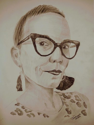 The three quarter view is one of my favorite perspectives for portraiture, her distinctive facial features, eyewear and earrings captured in graphite pencil. HB, 2B and 4B.