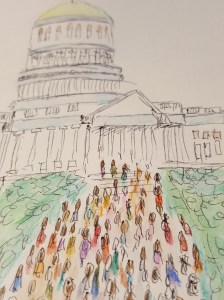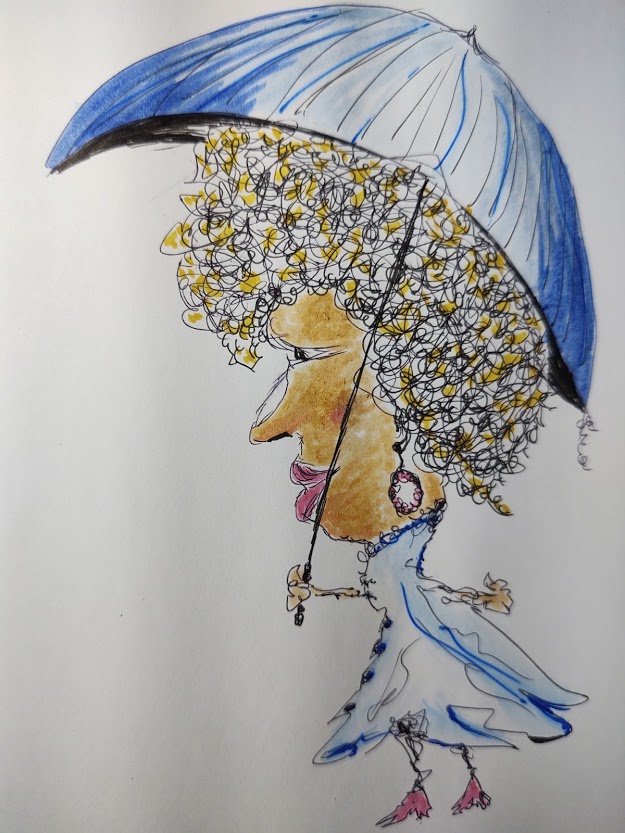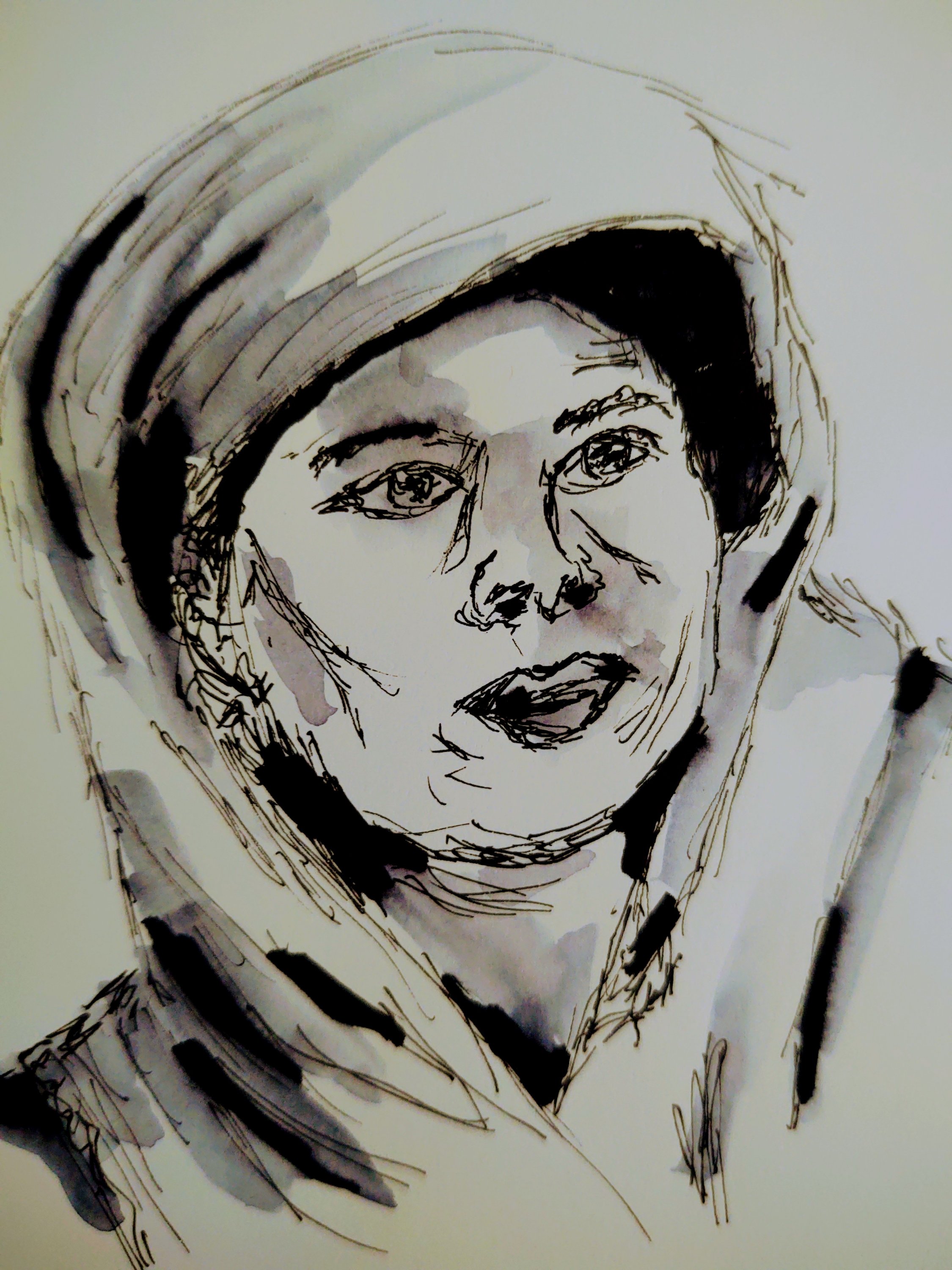 Her headscarf which added volume and interesting lines around her face along with her gaze, soft yet curious, were the draw for this muse. Loose lines, fast, some bold, some subtle in ink and washed with a water brush.